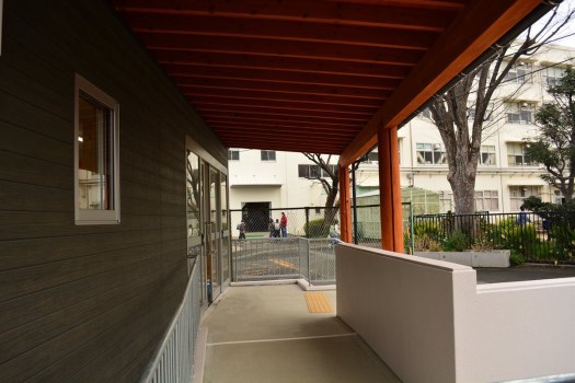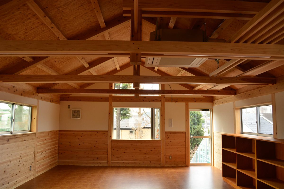 小学校の校庭に別棟で新築したキッズクラブ棟 木造2階 小屋組みは製材を用いたトラス構造 野地板に杉集成パネルを使用